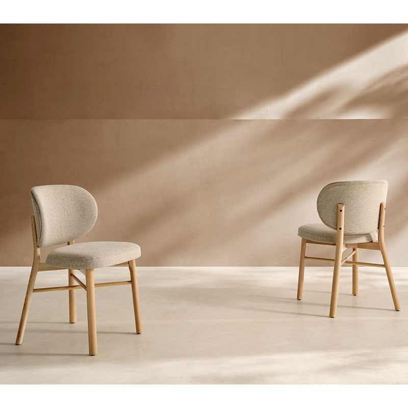 Silla N85 con respaldo curvado en madera de haya y tapizado acogedor. Combina diseño contemporáneo, confort y acabados personalizables para hogar o contract.