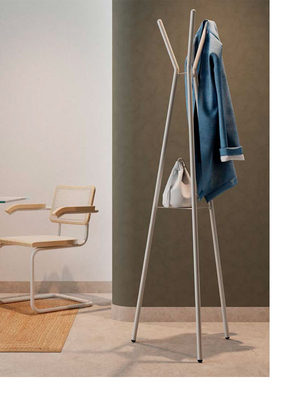 El Perchero de pie Tipi combina estética y funcionalidad en un diseño elegante y ligero. Fabricado en metal lacado, cuenta con una estructura en forma de trípode y un práctico soporte intermedio para bolsos o complementos. Ideal para oficinas, hogares o recepciones modernas.